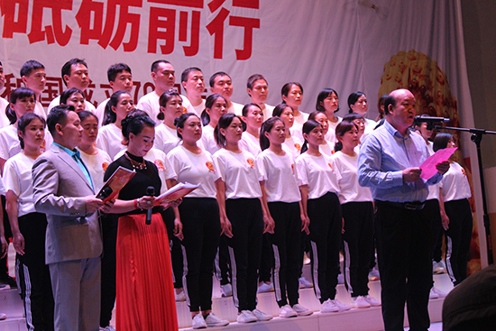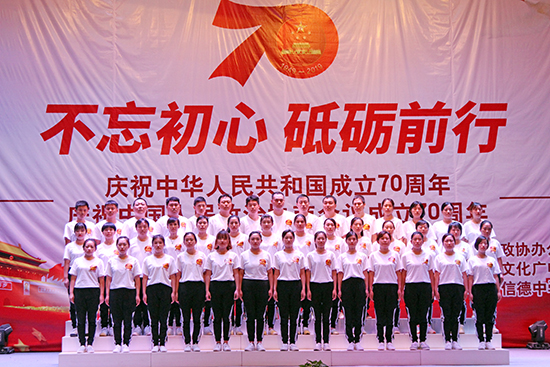 | 2019年9月20日,由辛集市政協(xié)辦公室、辛集市文化廣電體育和旅游局主辦,辛集市信德中學(xué)承辦的慶祝新中國成立70周年和中國人民政治協(xié)商會(huì)議成立70周年文藝演出在信德中學(xué)禮堂隆重舉行。 辛集市委副書記、政協(xié)主席姜保康、政協(xié)副主席崔文英、政協(xié)副主席陳貴房,文化廣電體育和旅游局局長(zhǎng)馬懷建、市委辦副主任范士杰、教育局副局長(zhǎng)姜彥華,民盟、民建、民革、九三學(xué)社、僑聯(lián)等民主黨派代表出席本次慶;顒(dòng)。河北國超信息科技有限公司(以下稱“我公司”)、河北申科電子股份有限公司、萬愛農(nóng)業(yè)科技有限公司、河北天意行榮威4S店、辛集一街荷塘月色舞蹈隊(duì)、辛集市實(shí)驗(yàn)學(xué)校、辛集市信德中學(xué)等單位的職工代表隊(duì)表演了精彩的節(jié)目。 我公司四十余名員工由總經(jīng)理曹艷爽親自帶隊(duì),組成合唱團(tuán)參加了本次演出。公司高層領(lǐng)導(dǎo)高度重視本次演出,為順利完成本次文藝演出,公司黨支部、工會(huì)與各部門負(fù)責(zé)人認(rèn)真組織部署,共先后組織員工精心排演20余次。文藝演出在我公司42名員工激昂、深情的《我和我的祖國》大合唱中拉開序幕,接著我們演唱了熱情、歡快的《洗衣歌》,用歌聲表達(dá)了對(duì)黨和祖國的熱愛,把對(duì)黨的追隨凝聚成力量,用出色的演出詮釋了不忘初心、牢記使命的錚錚誓言,獲得在場(chǎng)觀眾和領(lǐng)導(dǎo)的高度贊譽(yù)。
