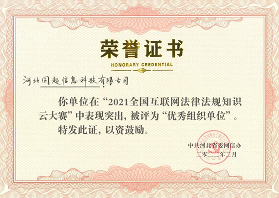 我公司在 “2021年全國互聯(lián)網(wǎng)法律法規(guī)知識云大賽” 中表現(xiàn)突出,被中共河北省委網(wǎng)信辦評為 “優(yōu)秀組織單位”。