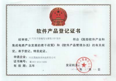 2014年8月18日,我公司研發(fā)的GC汽車手冊(cè)編寫與智能DTP軟件、GC網(wǎng)上項(xiàng)目庫管理系統(tǒng)順利通過河北省軟件評(píng)測(cè)中心評(píng)測(cè),并獲得了河北省工業(yè)和信息化廳頒發(fā)的軟件產(chǎn)品登記證書。