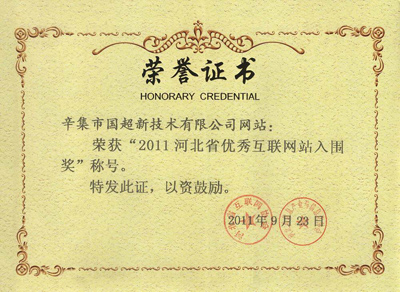 | 2011年5月,河北省工業(yè)和信息化管理廳,河北省通信管理局,海北省互聯(lián)網(wǎng)協(xié)會,河北省信息產(chǎn)業(yè)與信息化協(xié)會聯(lián)合組織開展了以“和諧社會,文明網(wǎng)站”為主題的河北省首屆優(yōu)秀互聯(lián)網(wǎng)站評選活動。 活動歷時四個多月,有網(wǎng)上報名、問卷調(diào)查、技術(shù)測評、專家評審、主管部門審核,社會公開五個階段。經(jīng)評選批準(zhǔn),我河北國超信息科技有限公司網(wǎng)站榮獲“2011年度河北省優(yōu)秀互聯(lián)網(wǎng)站入圍獎”。2011年9月23日,在石家莊國際科技博覽中心召開表彰大會,會上為我公司及59家獲獎單位頒發(fā)了獎牌和證書。我公司董事長劉占查出席會議并授獎。